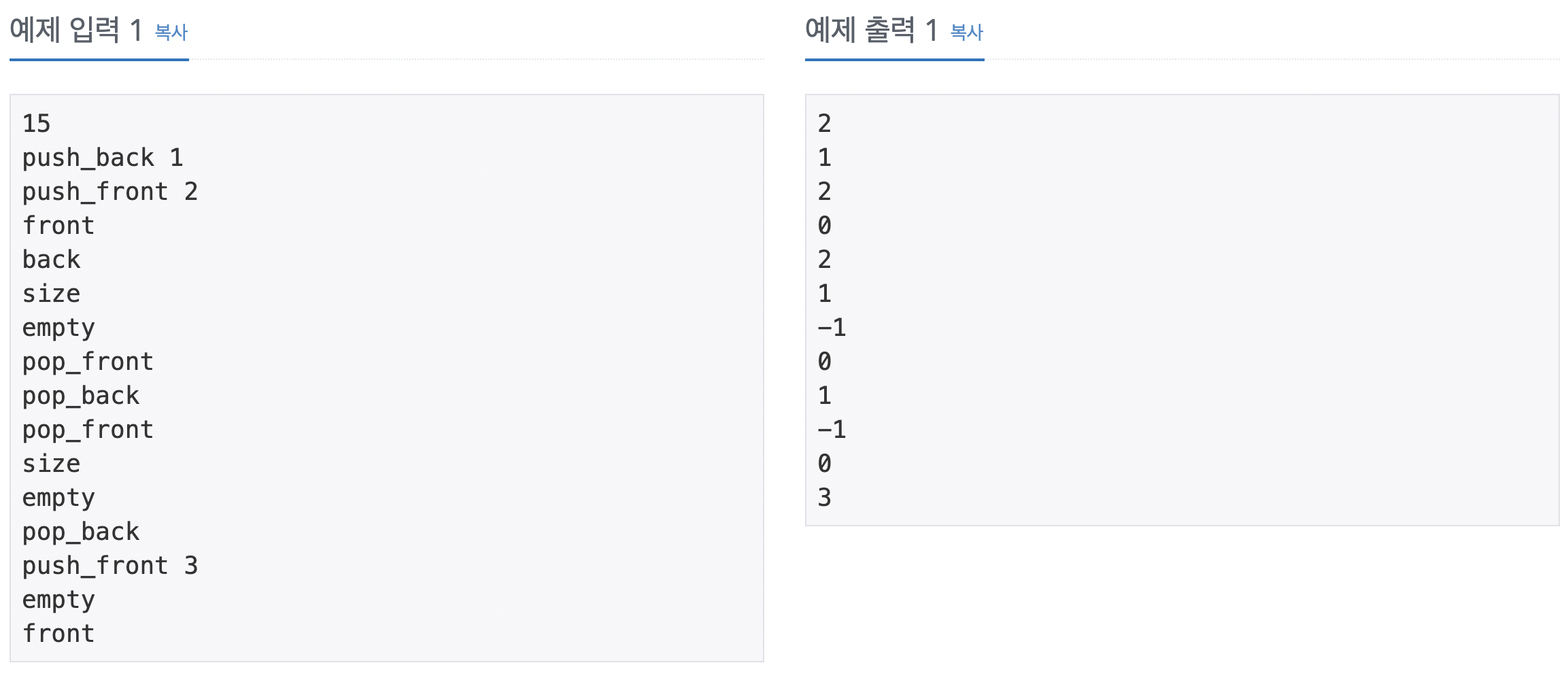 정수를 저장하는 덱(Deque)를 구현한 다음, 입력으로 주어지는 명령을 처리하는 프로그램을 작성하시오.