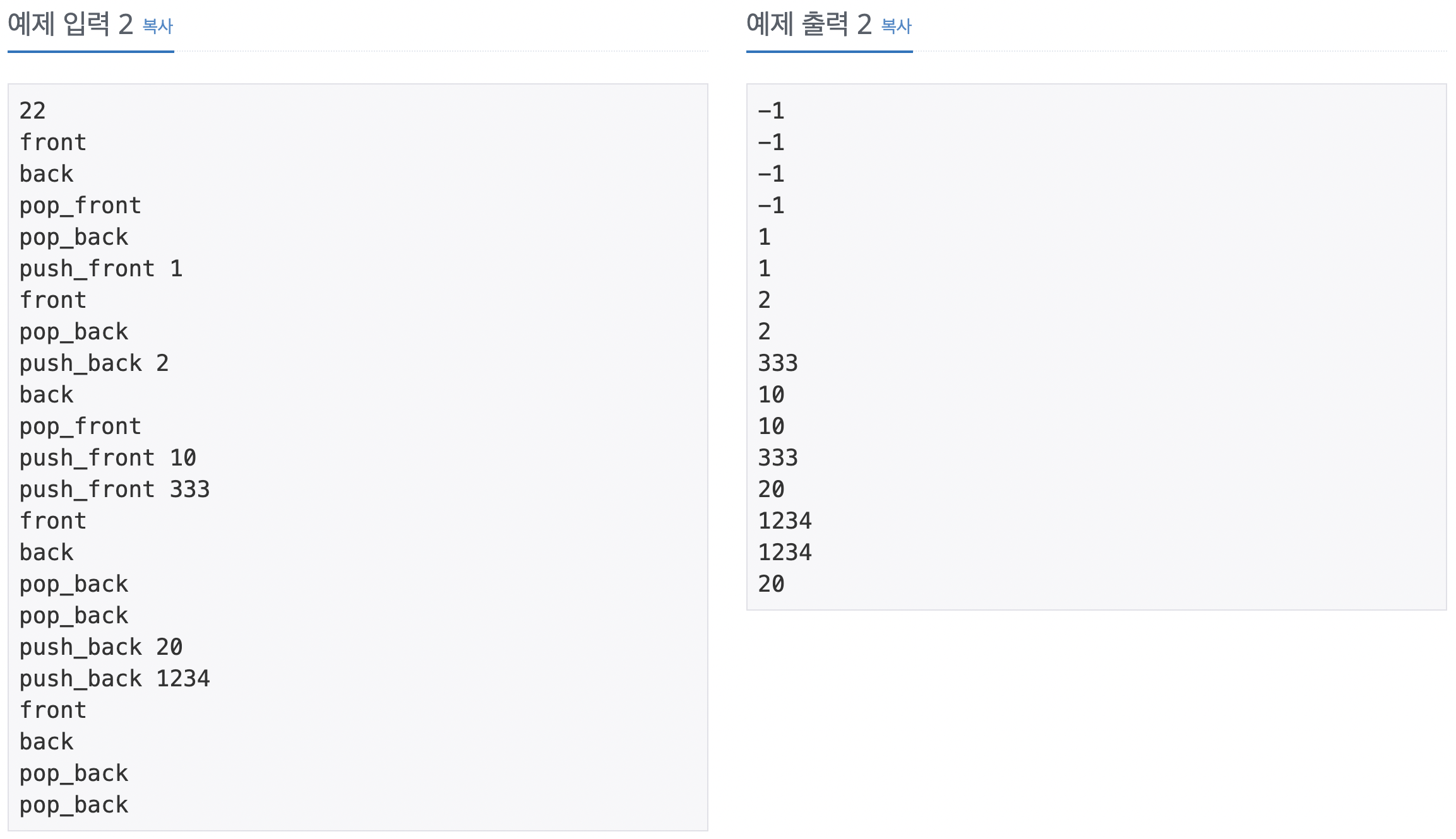 - pop_front: 덱의 가장 앞에 있는 수를 빼고, 그 수를 출력한다. 만약, 덱에 들어있는 정수가 없는 경우에는 -1을 출력한다.