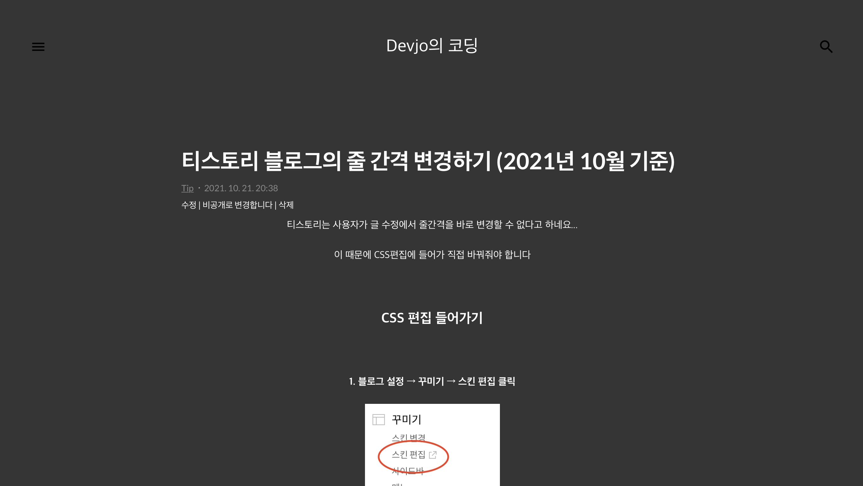 | 티스토리 블로그의 줄 간격 변경하기 (2021년 10월 기준) (3) | 2021.10.21 |