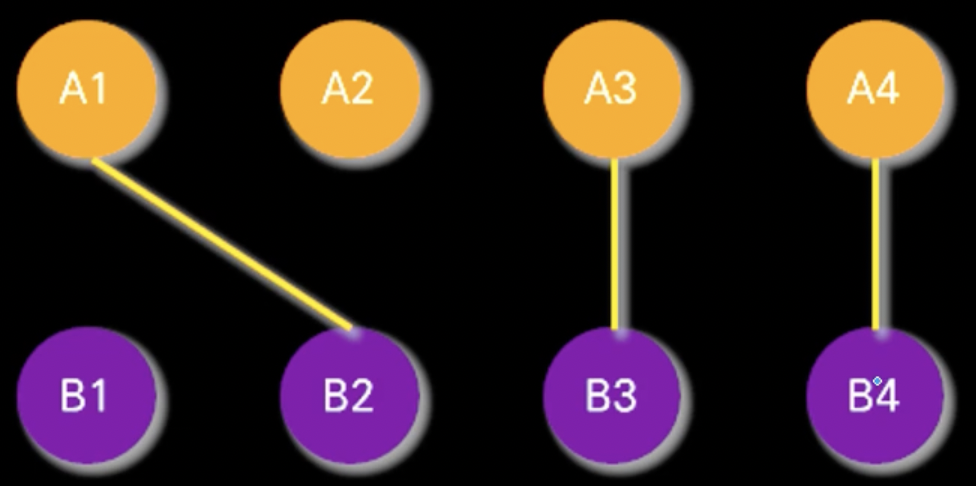 여기서는 모든 사람이 단 한 명의 이성을 좋아하는 상황이다. 아래 그래프에서 A1~A4와 B1~B4처럼 어떤 사람, 사물 등을
