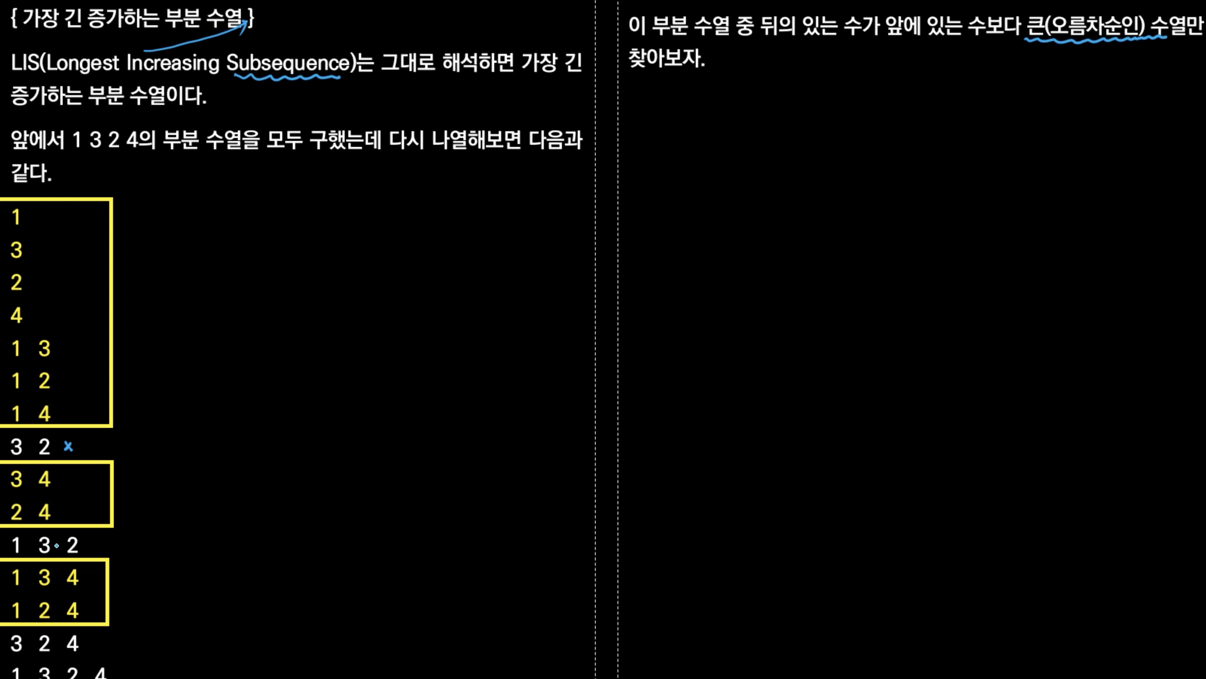 Longest Increasing Subsequence는 해석 그대로 가장 긴 증가하는 부분 수열이다. 앞에서 1 3 2 4의 부분 수열을 모두 구했는데 다시 나열해보면 다음과 같다.
