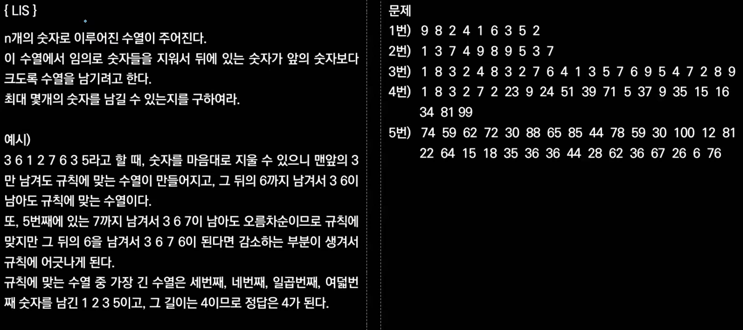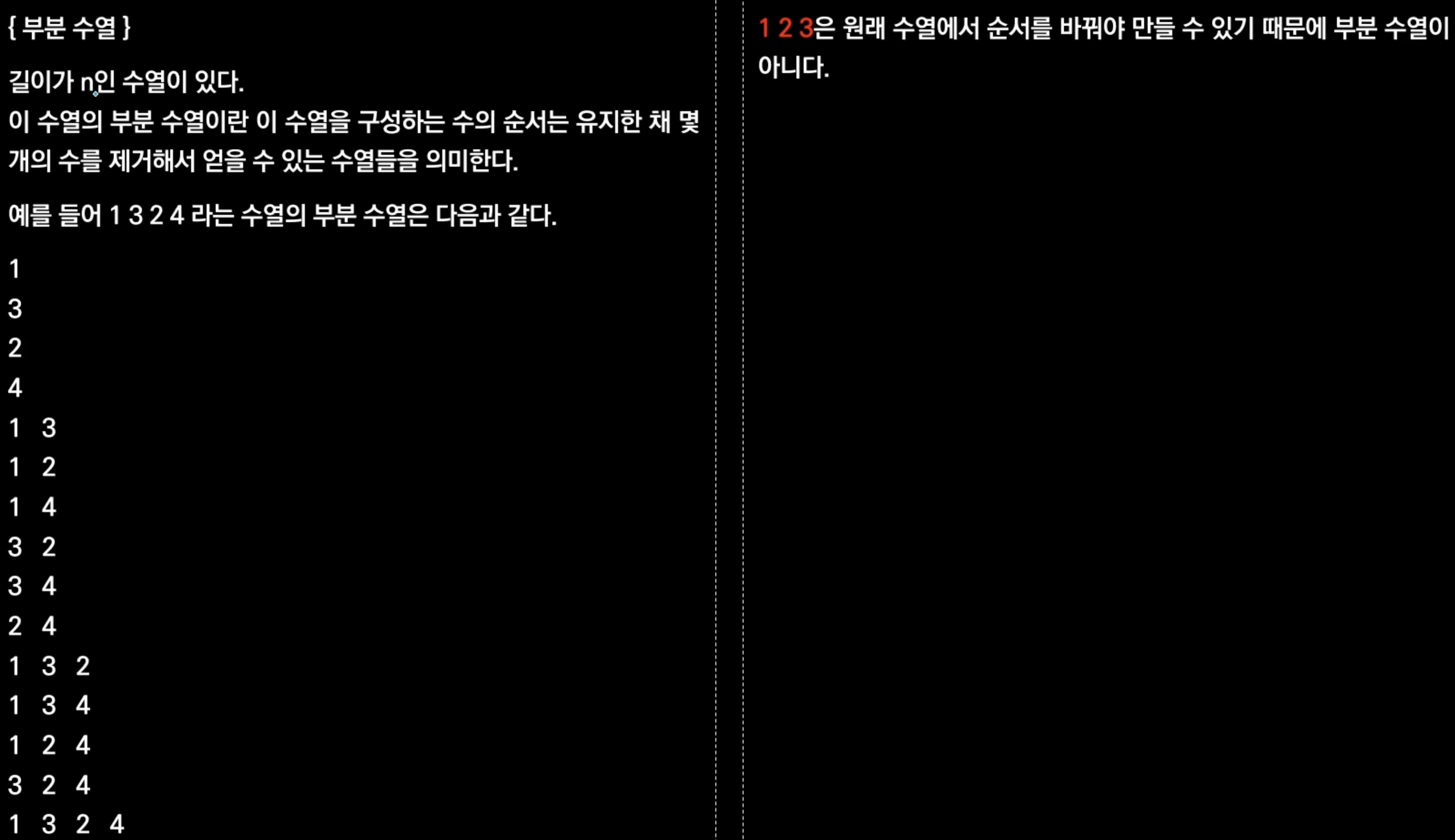 부분수열을 먼저 이해하자. 수열의 부분 수열이란 수의 순서는 유지한 채 몇 개의 수를 제거해서 얻을 수 있는 수열을 의미한다.