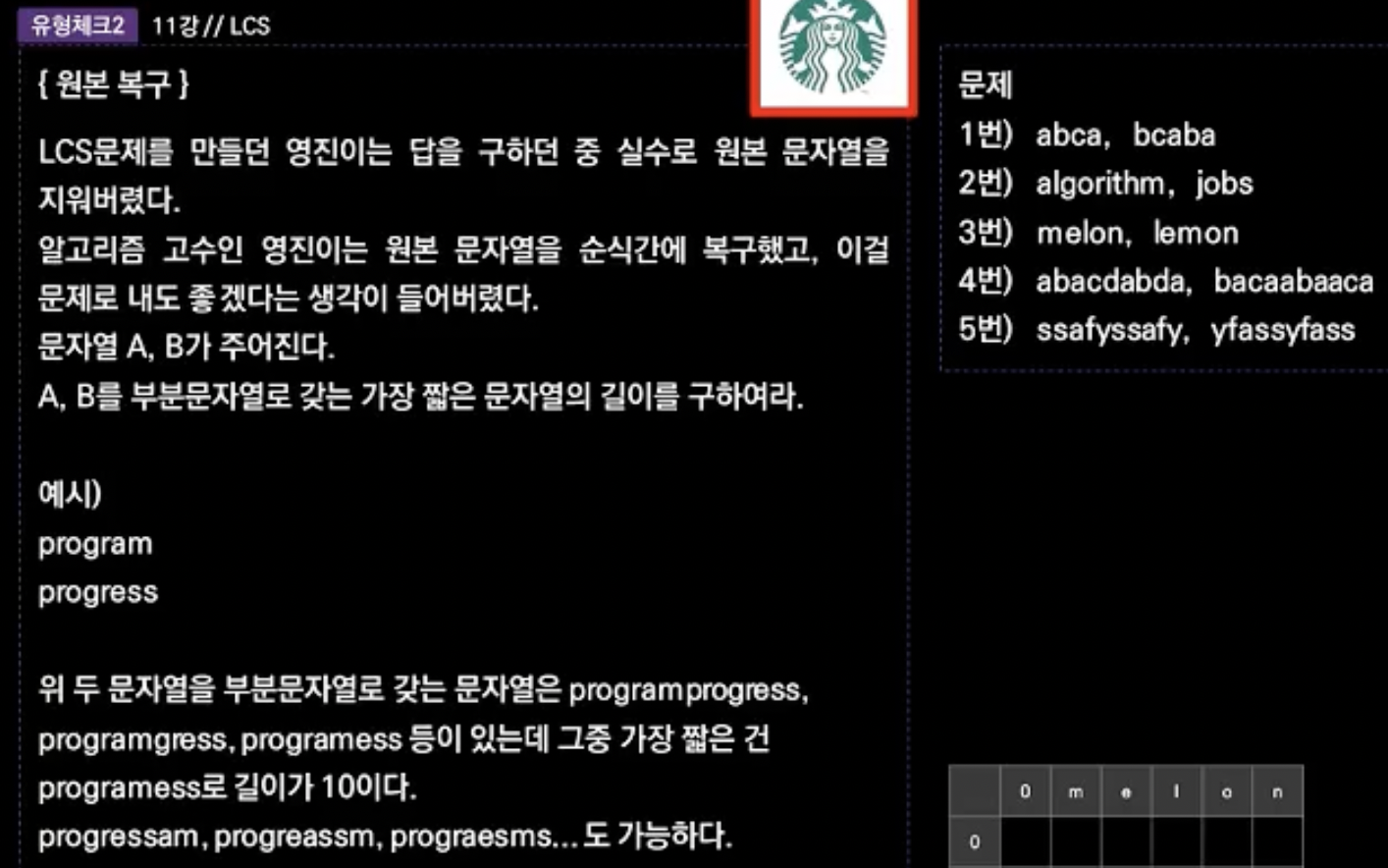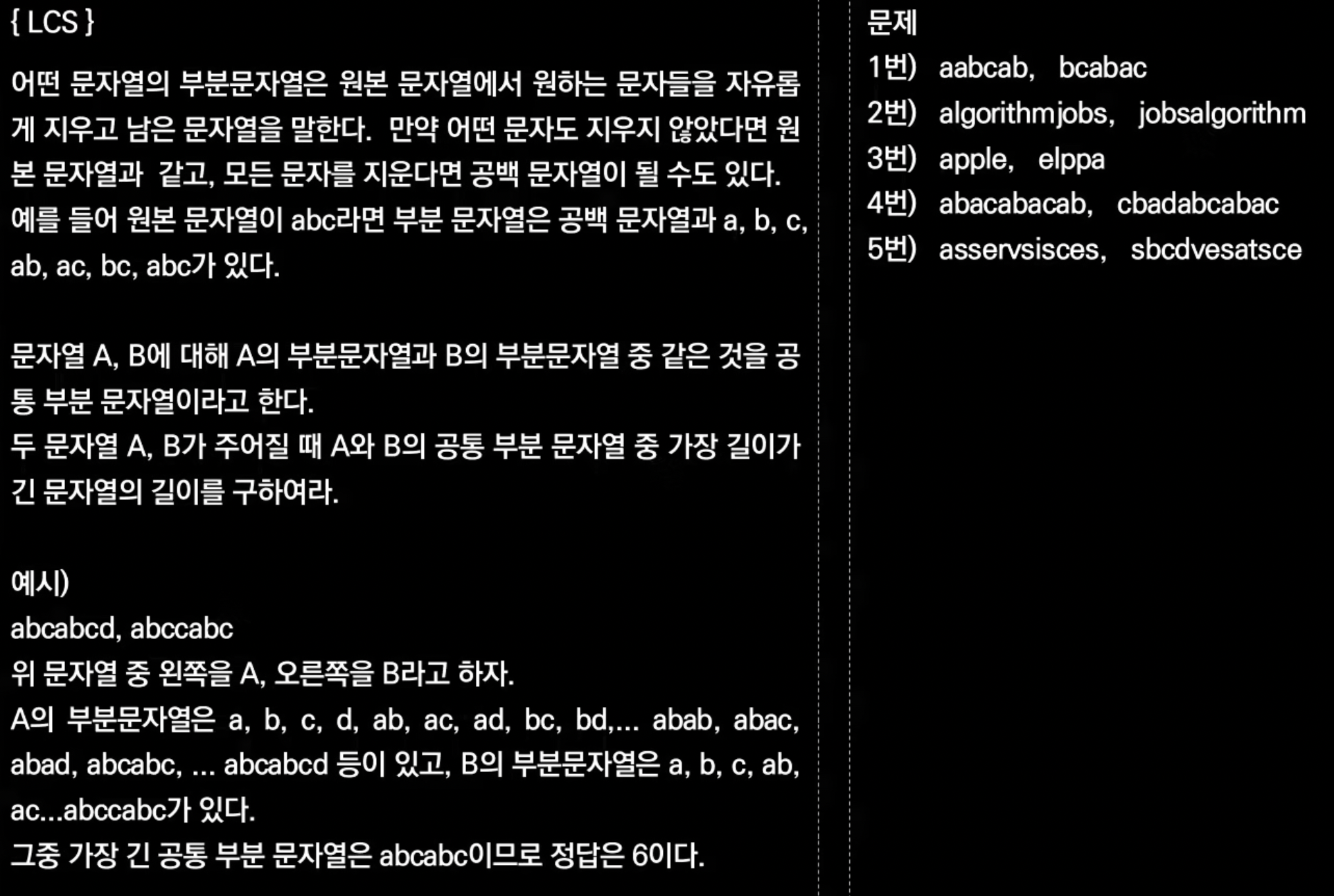 LCS(Longest Common Subsequence) 문제는 두 문자열 A, B가 주어질 때, A의 부분 문자열이면서 B의 부분 문자열인 문자열 중 가장 긴 것의 길이를 구하는 문제다. 예를 들어 abacd와 abca의 공통 부분 문자열은 다음과 같다.