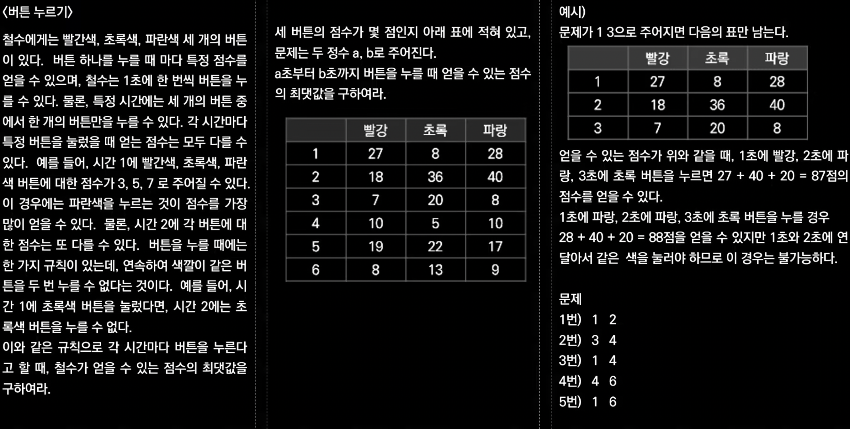 ① 1차원 점화식에서 사용했던 표가 두 줄 혹은 세 줄 정도 나와서 서로 영향을 주는 경우