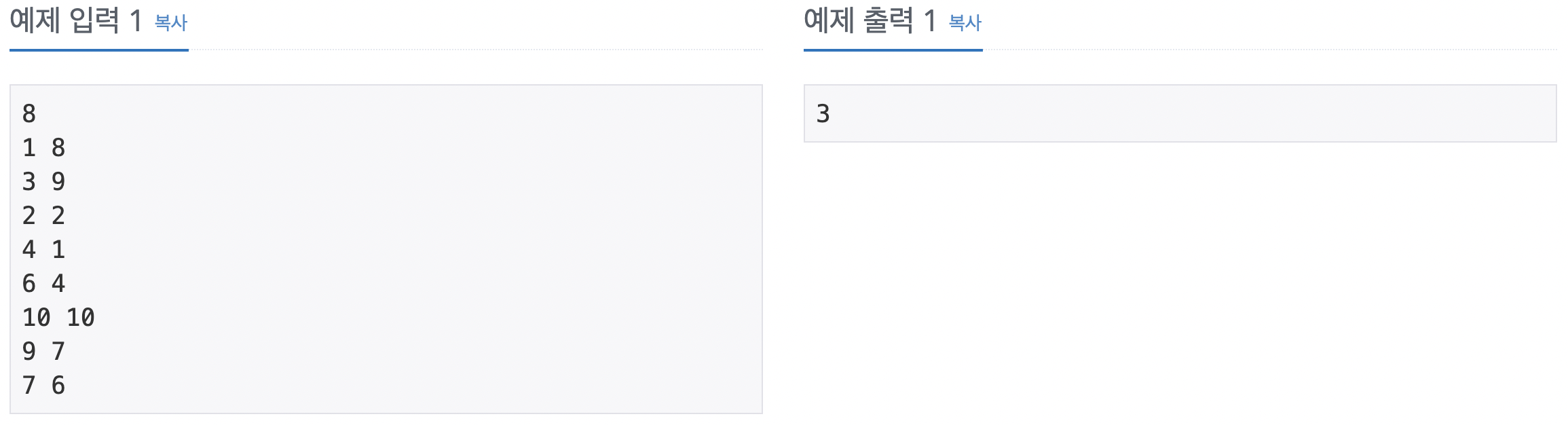 첫째 줄에는 두 전봇대 사이의 전깃줄의 개수가 주어진다. 전깃줄의 개수는 100 이하의 자연수이다. 둘째 줄부터 한 줄에 하나씩 전깃줄이 A전봇대와 연결되는 위치의 번호와 B전봇대와 연결되는 위치의 번호가 차례로 주어진다. 위치의 번호는 500 이하의 자연수이고, 같은 위치에 두 개 이상의 전깃줄이 연결될 수 없다.