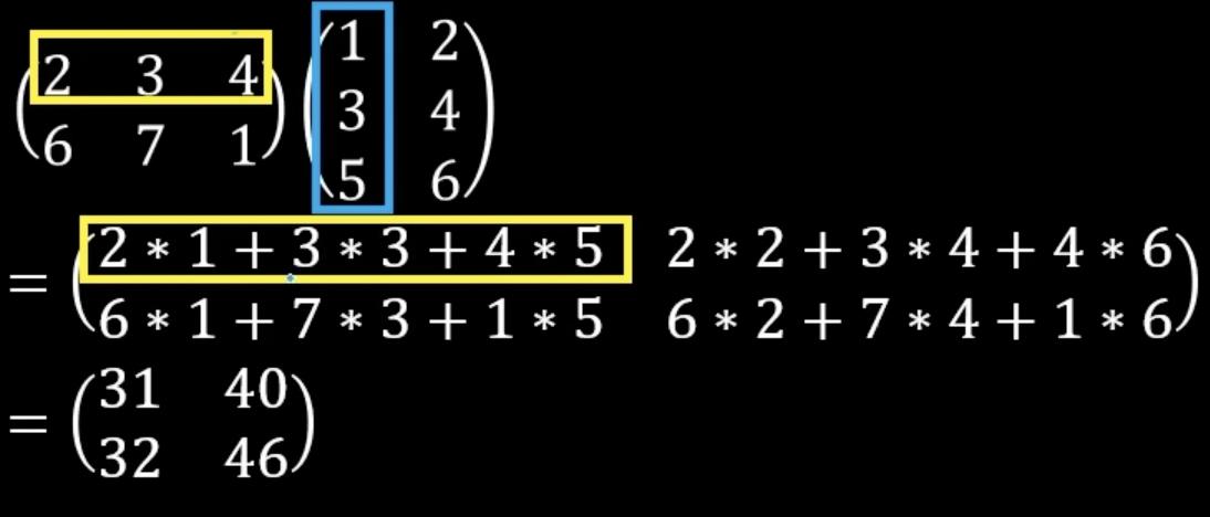 A, B 두 행렬을 곱하려면 A의 열 수와 B의 행의 수가 같아야 한다. A가 n X m, B가 m X k 행렬이라면 결과는 n X k 행렬이 된다.