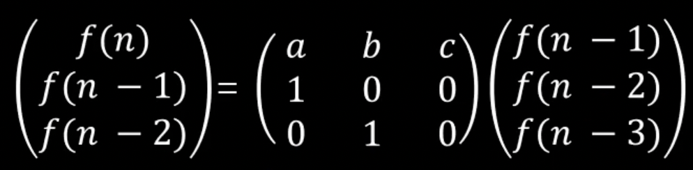 점화식이 f(n) = af(n-1) + bf(n-2) + cf(n-3)이라면 f(n)을 구하기 위해 3개의 항이 필요하므로 3 X 3 크기의 행렬을 만든다.