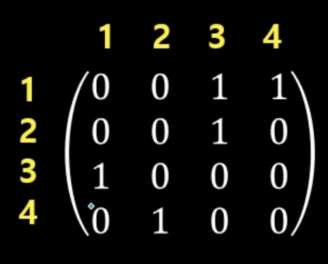 그래프의 노드가 1~4번까지 존재한다고 하자. 1번에서 3번, 1번에서 4번 2번에서 3번, 3번에서 1번, 4번에서 2번으로 가는 단방향 간선이 있다면 오른쪽과 같은 행렬로 표현 가능하다. 이를 인접행렬이라고 한다.