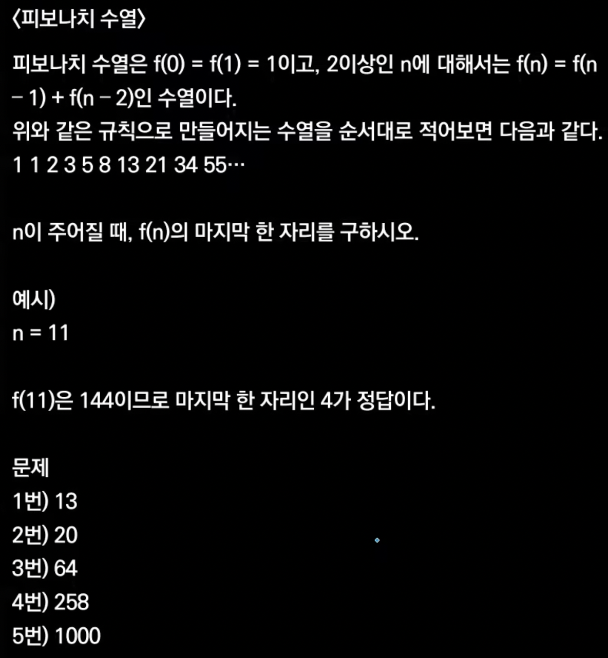 이 수식을 이용해 1025항을 구해보자. 단 수가 너무 커질 수 있으므로 십의 자리 이상은 지우고 마지막 한자리만 구해보자. 피보나치 점화식으로 직접 1024번의 계산을 하지 않고 이 수식으로 약 10번의 행렬 제곱을 통해 f(1025)를 구할 수 있다.