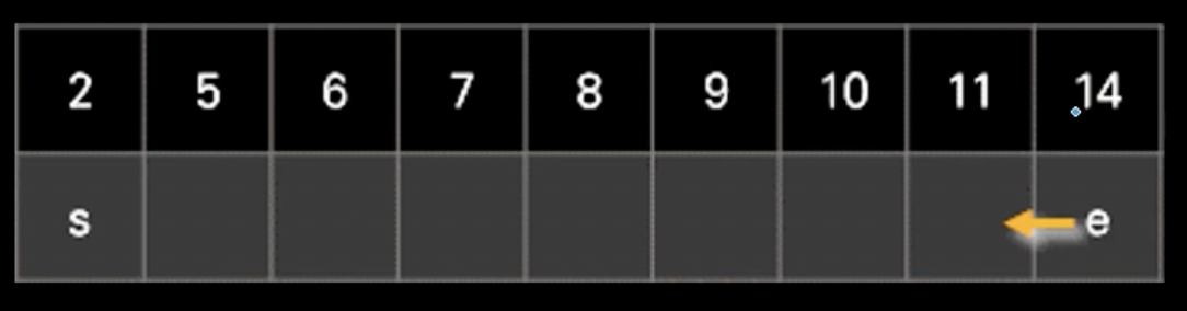 s와 e의 현재합은 2+14므로 12를 만들기 위해 s와 e가 모두 왼쪽으로 이동할 수 있다. 하지만 s는 처음 위치므로 e만 왼쪽으로 이동할 수 있다. 또한 14와 11은 절대 답이 될 수 없으므로 표에서 제거해도 된다. s가 2일 때 e가 10의 위치에 도달하면 12를 만들 수 있다.