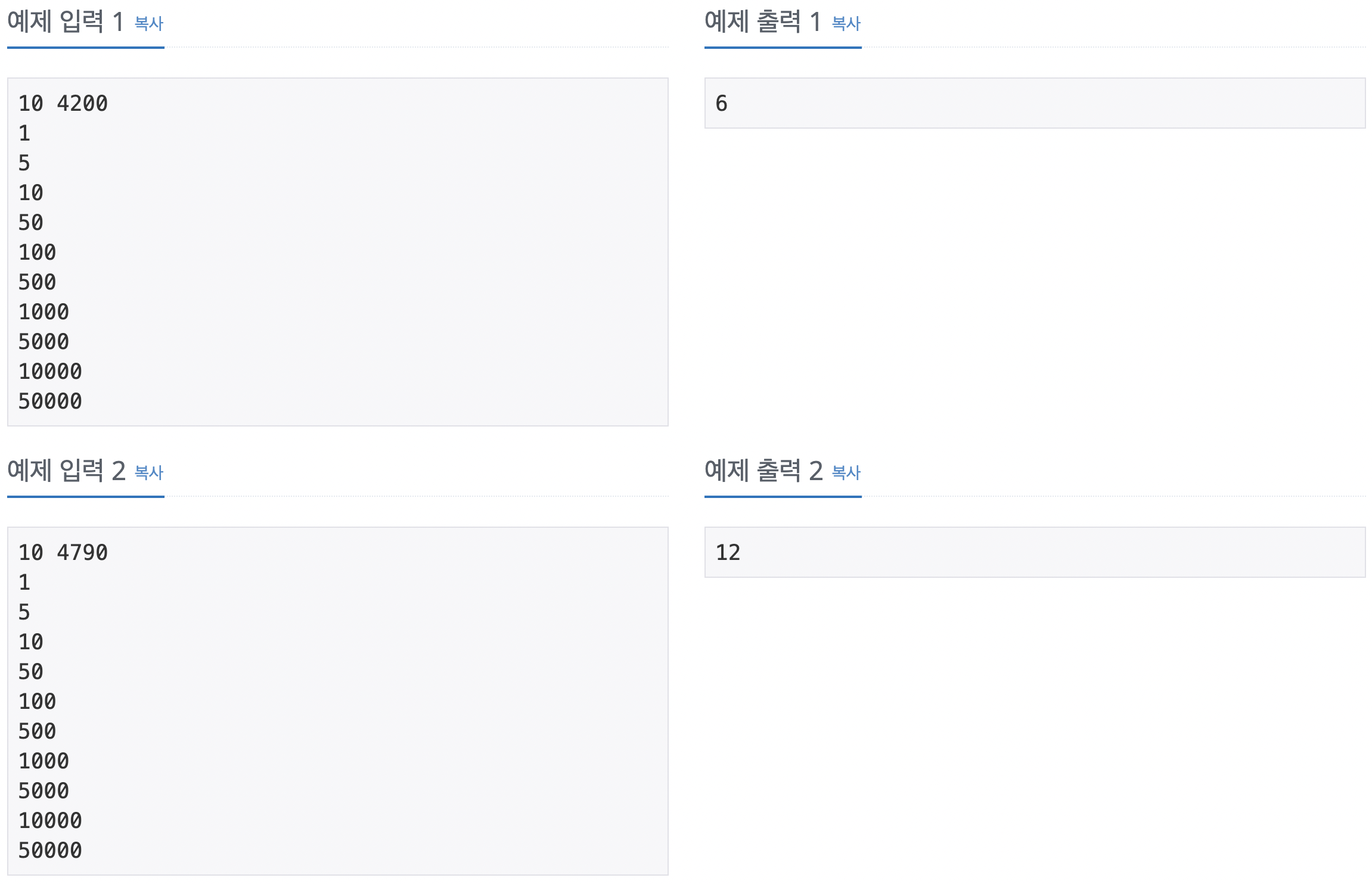 동전을 적절히 사용해서 그 가치의 합을 K로 만들려고 한다. 이때 필요한 동전 개수의 최솟값을 구하는 프로그램을 작성하시오.