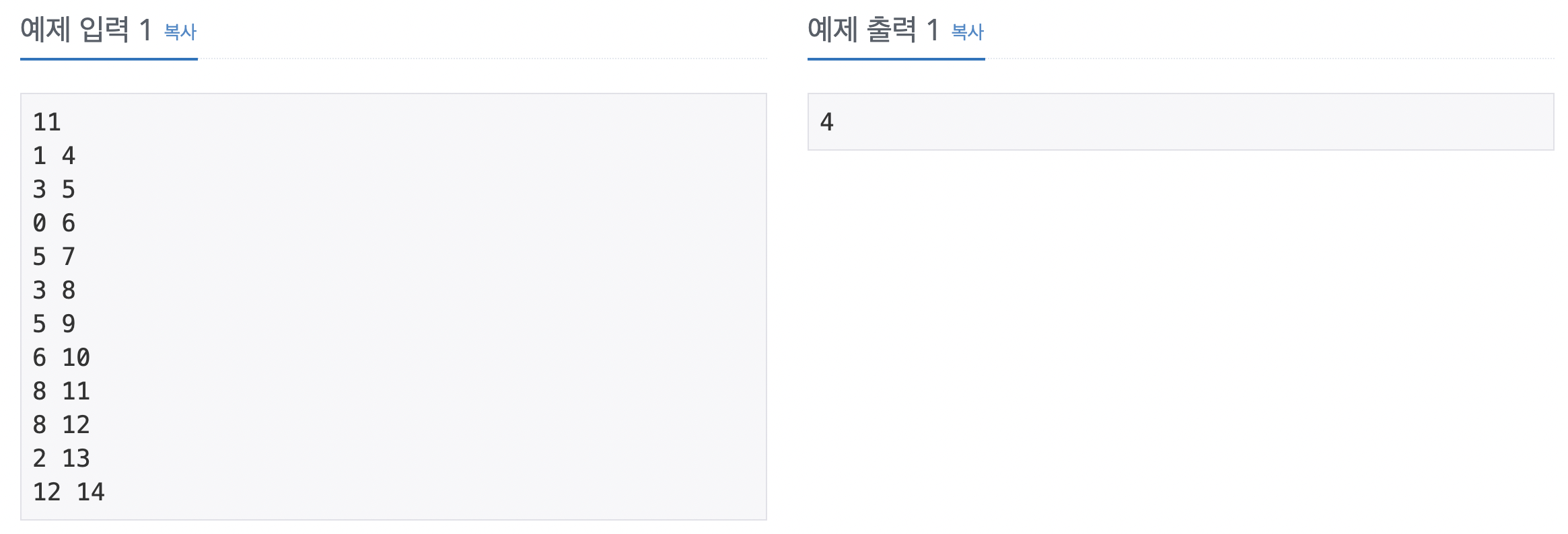 한 개의 회의실이 있는데 이를 사용하고자 하는 N개의 회의에 대하여 회의실 사용표를 만들려고 한다. 각 회의 I에 대해 시작시간과 끝나는 시간이 주어져 있고, 각 회의가 겹치지 않게 하면서 회의실을 사용할 수 있는 회의의 최대 개수를 찾아보자. 단, 회의는 한번 시작하면 중간에 중단될 수 없으며 한 회의가 끝나는 것과 동시에 다음 회의가 시작될 수 있다. 회의의 시작시간과 끝나는 시간이 같을 수도 있다. 이 경우에는 시작하자마자 끝나는 것으로 생각하면 된다.
