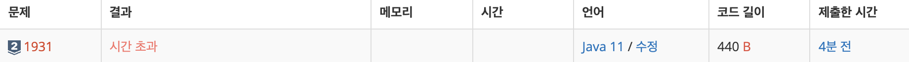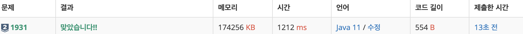 정렬을 한 후에는 이미 시간 순으로 나열되어있기 때문에 반복문을 한 번 돌리면서 값을 구할 수 있게 된다.