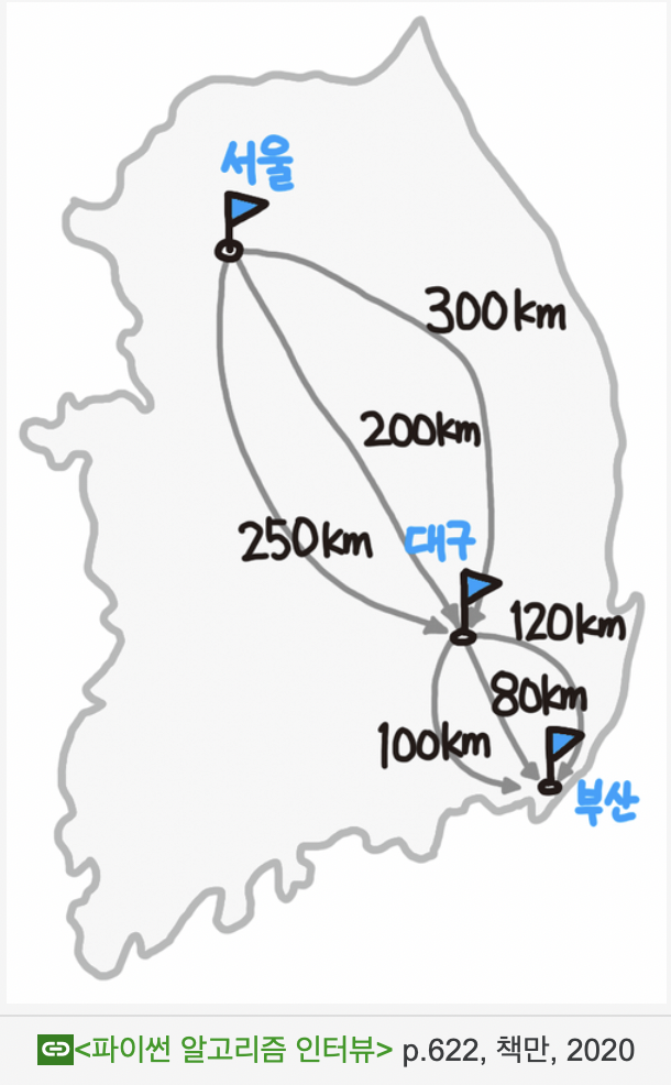 위 그림을 참고해 서울 → 부산을 가는 최소 경로를 구해보자