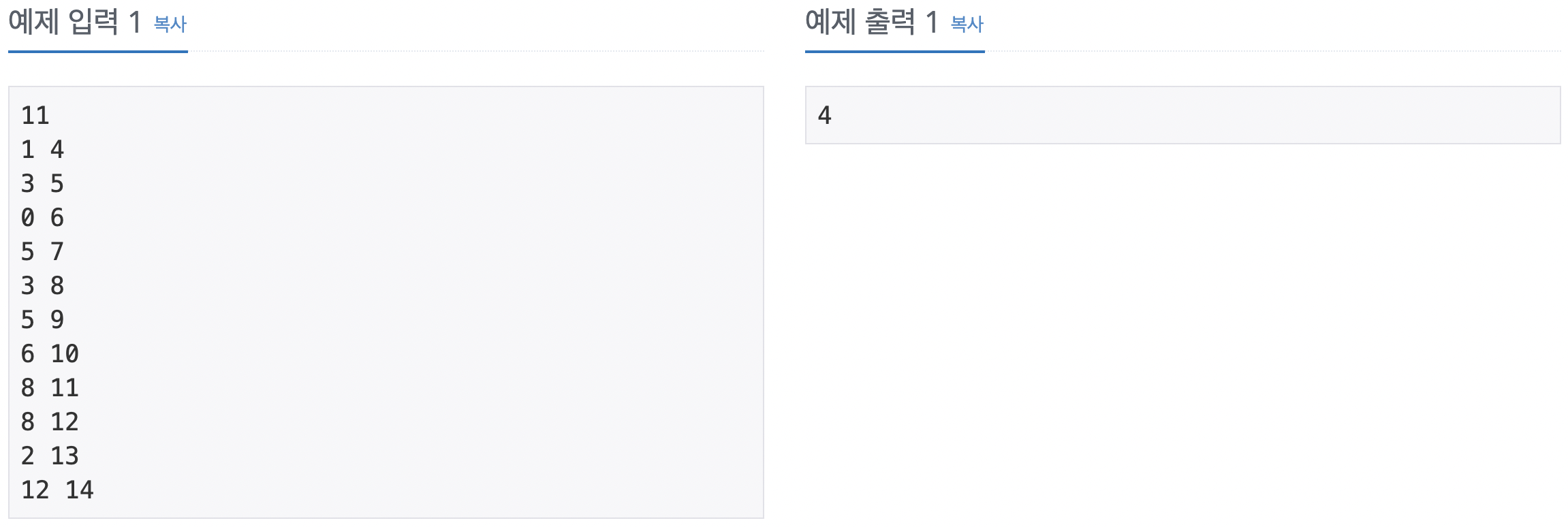 문제: 한 개의 회의실이 있는데 이를 사용하고자 하는 N개의 회의에 대하여 회의실 사용표를 만들려고 한다. 각 회의 I에 대해 시작시간과 끝나는 시간이 주어져 있고, 각 회의가 겹치지 않게 하면서 회의실을 사용할 수 있는 회의의 최대 개수를 찾아보자. 단, 회의는 한번 시작하면 중간에 중단될 수 없으며 한 회의가 끝나는 것과 동시에 다음 회의가 시작될 수 있다. 회의의 시작시간과 끝나는 시간이 같을 수도 있다. 이 경우에는 시작하자마자 끝나는 것으로 생각하면 된다.
