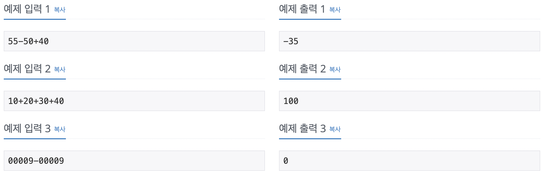 첫째 줄에 식이 주어진다. 식은 ‘0’~‘9’, ‘+’, 그리고 ‘-’만으로 이루어져 있고, 가장 처음과 마지막 문자는 숫자이다. 그리고 연속해서 두 개 이상의 연산자가 나타나지 않고, 5자리보다 많이 연속되는 숫자는 없다. 수는 0으로 시작할 수 있다. 입력으로 주어지는 식의 길이는 50보다 작거나 같다.