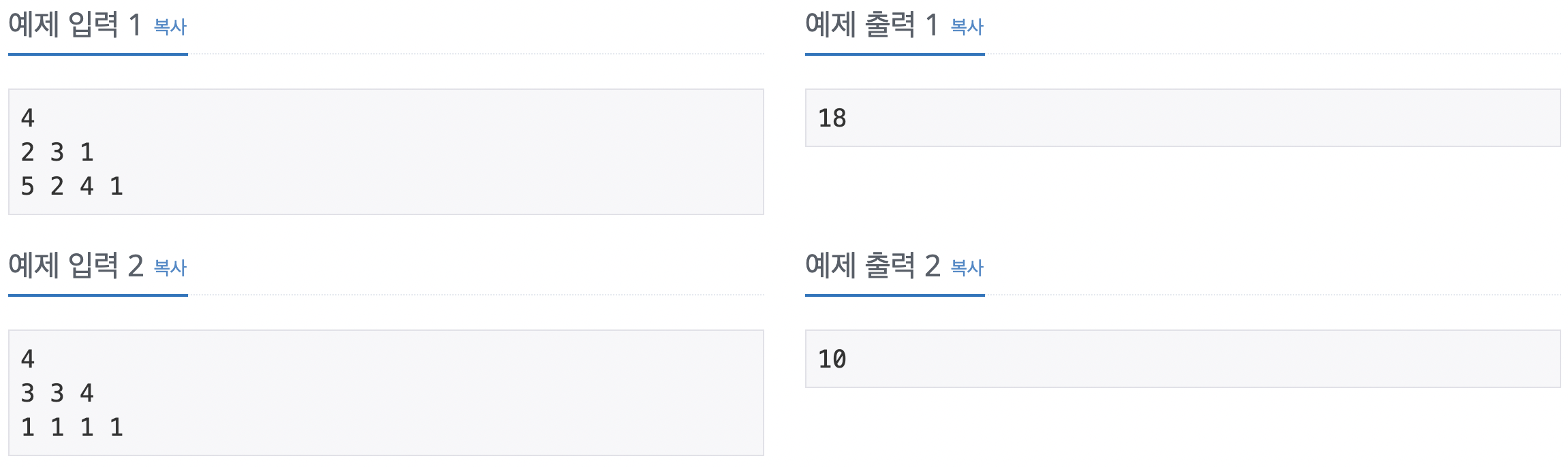 표준 입력으로 다음 정보가 주어진다. 첫 번째 줄에는 도시의 개수를 나타내는 정수 N(2 ≤ N ≤ 100,000)이 주어진다. 다음 줄에는 인접한 두 도시를 연결하는 도로의 길이가 제일 왼쪽 도로부터 N-1개의 자연수로 주어진다. 다음 줄에는 주유소의 리터당 가격이 제일 왼쪽 도시부터 순서대로 N개의 자연수로 주어진다. 제일 왼쪽 도시부터 제일 오른쪽 도시까지의 거리는 1이상 1,000,000,000 이하의 자연수이다. 리터당 가격은 1 이상 1,000,000,000 이하의 자연수이다.