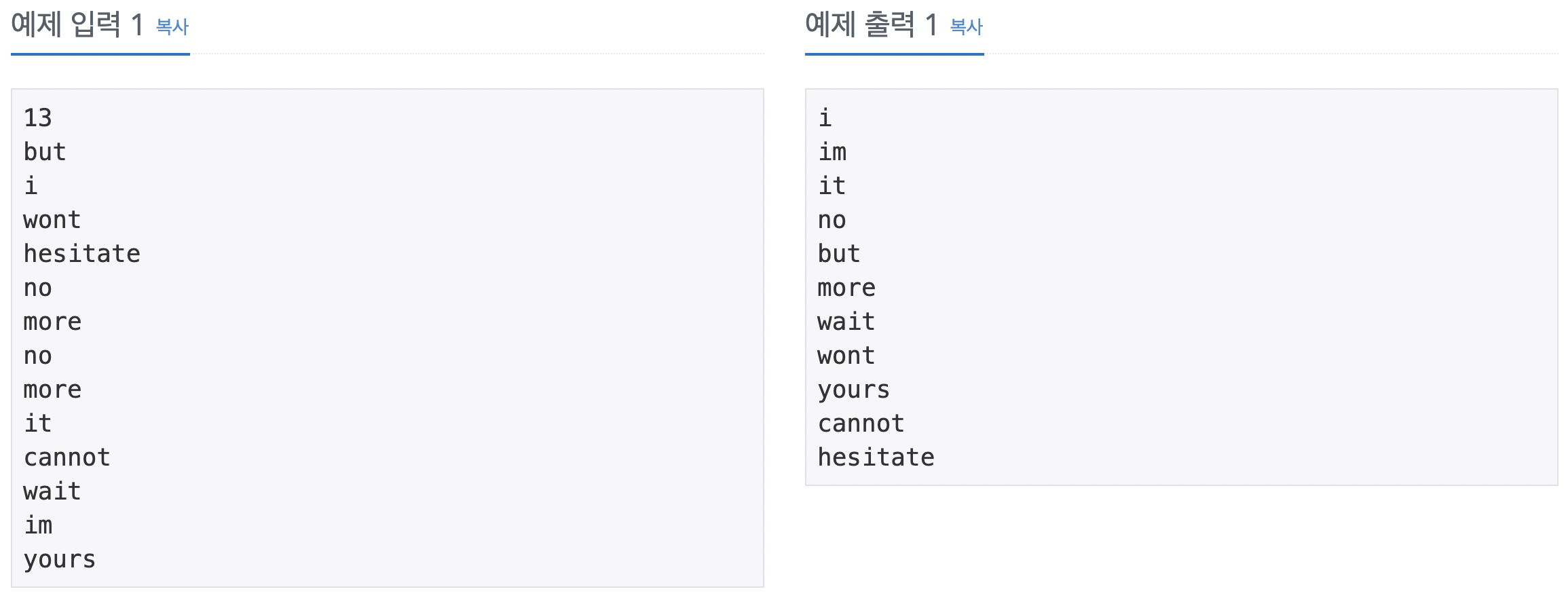 첫째 줄에 단어의 개수 N이 주어진다. (1 ≤ N ≤ 20,000) 둘째 줄부터 N개의 줄에 걸쳐 알파벳 소문자로 이루어진 단어가 한 줄에 하나씩 주어진다. 주어지는 문자열의 길이는 50을 넘지 않는다.