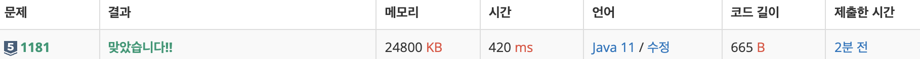 두번째 방법이 조금 더 효율적인 것 같았다. Arrays.sort로 적용한 뒤 글자 길이에 대해서만 나열하면 되기 때문이다