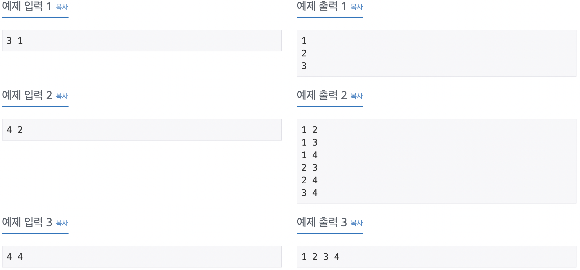 첫째 줄에 자연수 N과 M이 주어진다. (1 ≤ M ≤ N ≤ 8)