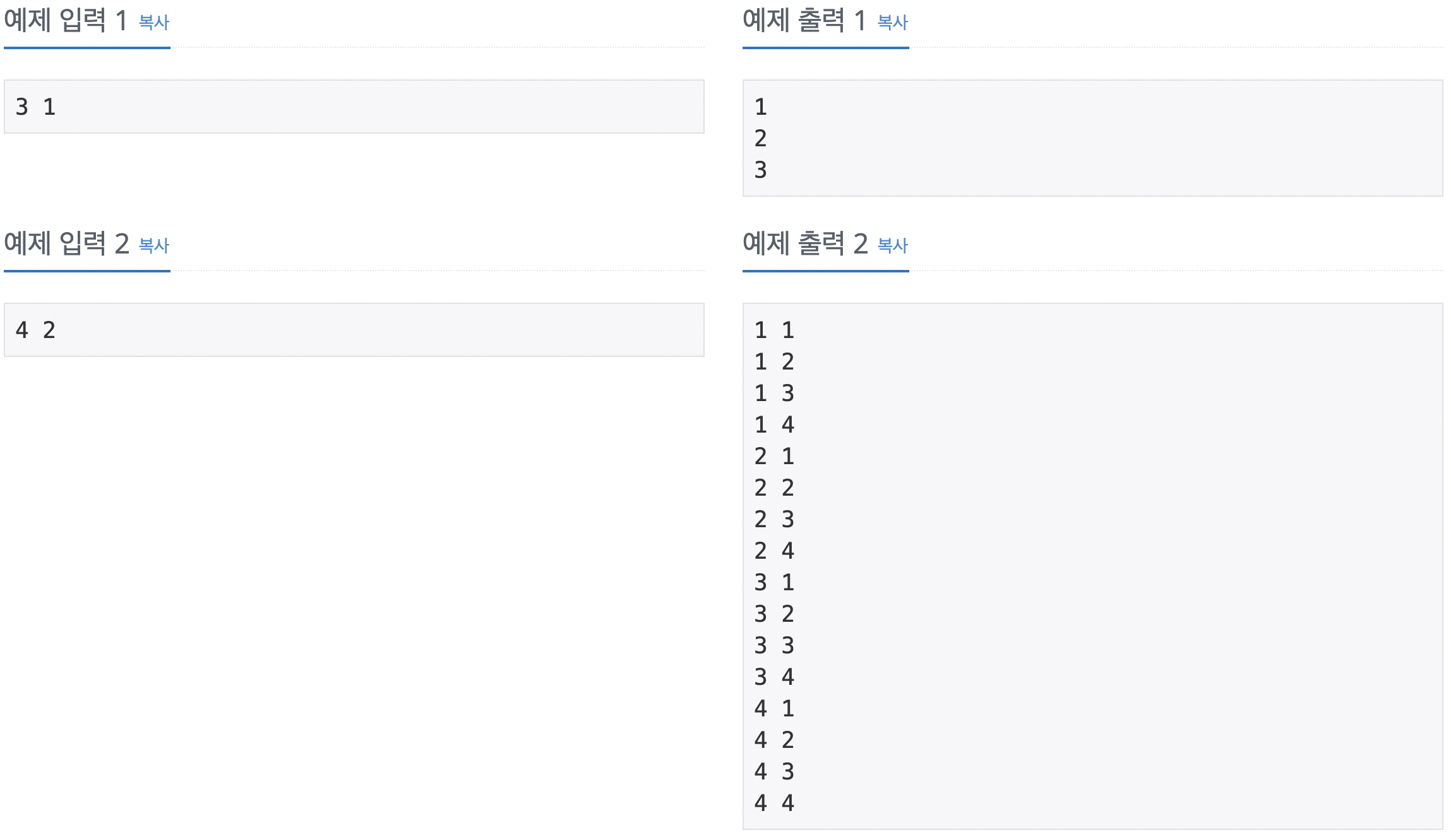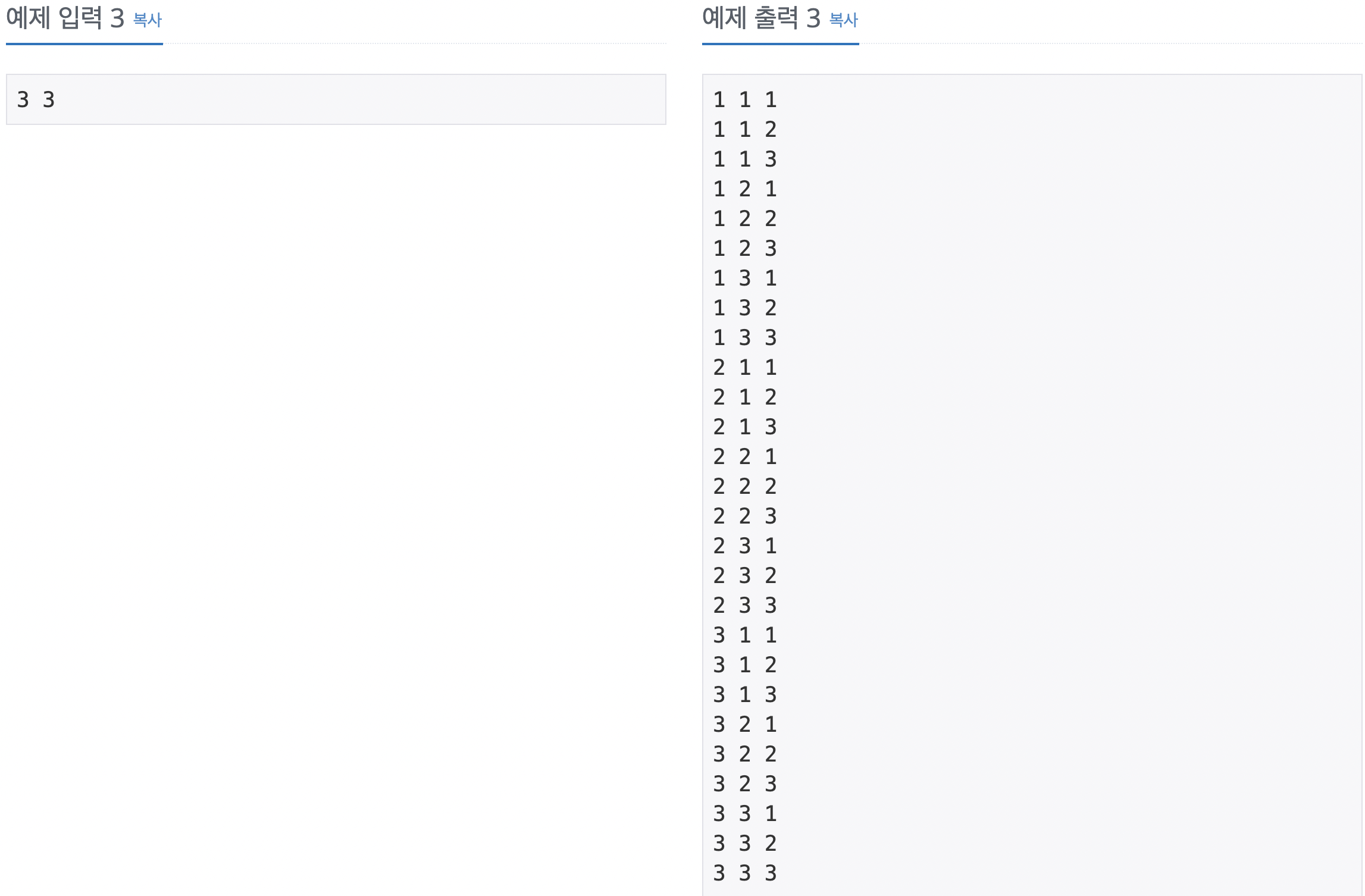 첫째 줄에 자연수 N과 M이 주어진다. (1 ≤ M ≤ N ≤ 7)