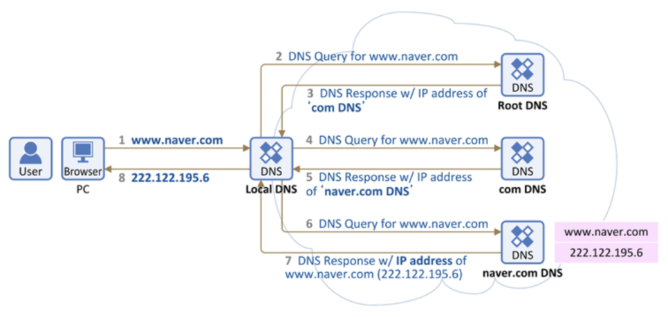 Client(나) "찾아줘" → Local DNS "찾아줘" → Root DNS "오키"