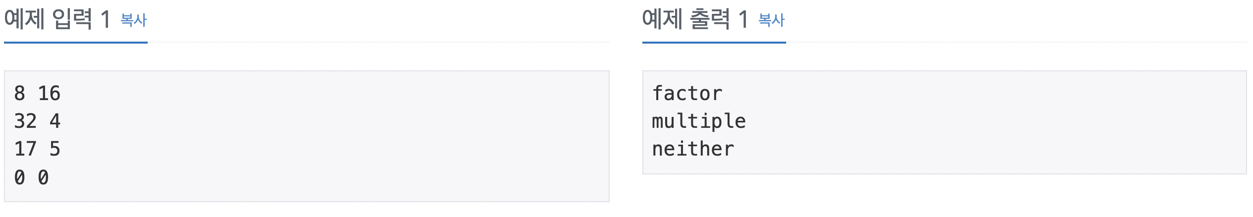 각 테스트 케이스마다 첫 번째 숫자가 두 번째 숫자의 약수라면 factor를, 배수라면 multiple을, 둘 다 아니라면 neither를 출력한다.