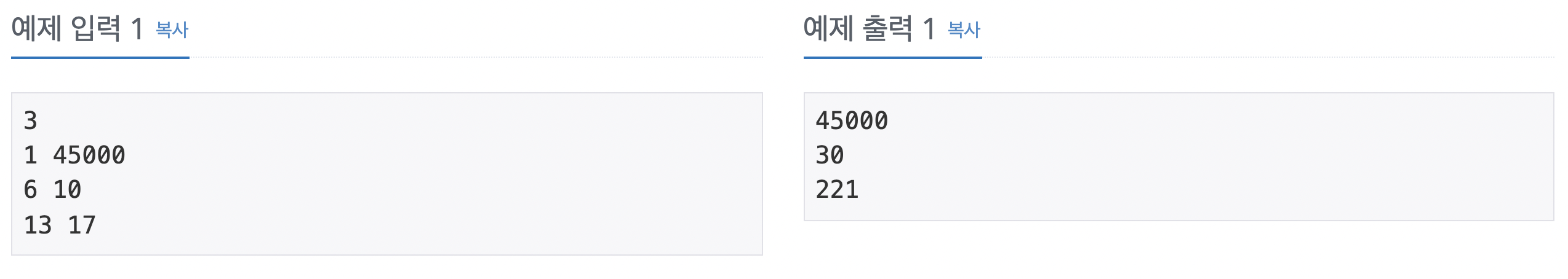 첫째 줄에 테스트 케이스의 개수 T(1 ≤ T ≤ 1,000)가 주어진다. 둘째 줄부터 T개의 줄에 걸쳐서 A와 B가 주어진다. (1 ≤ A, B ≤ 45,000)