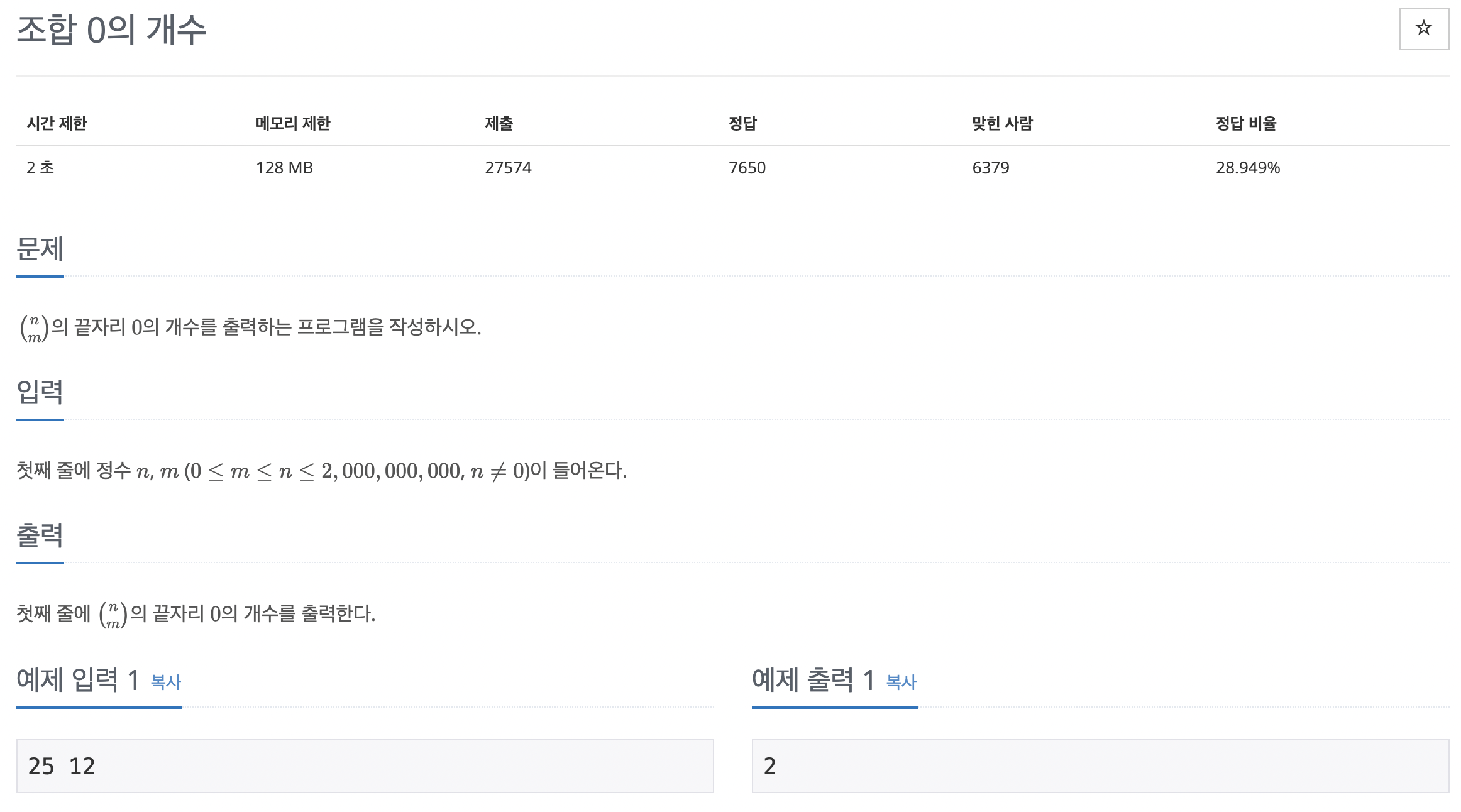 입력한 N, M에 대해 N! M! (N-M)!의 5의 개수를 구한다