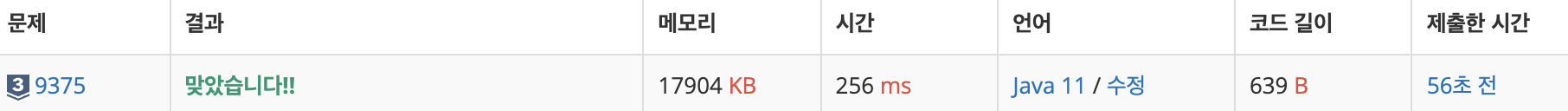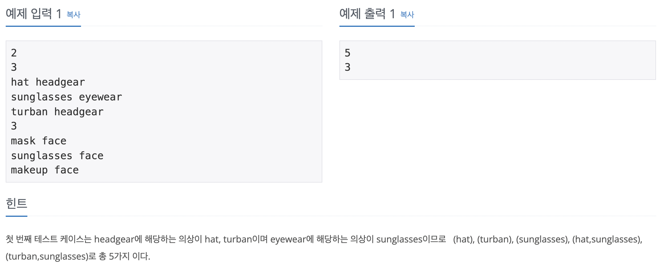 - 다음 n개에는 해빈이가 가진 의상의 이름과 의상의 종류가 공백으로 구분되어 주어진다. 같은 종류의 의상은 하나만 입을 수 있다.