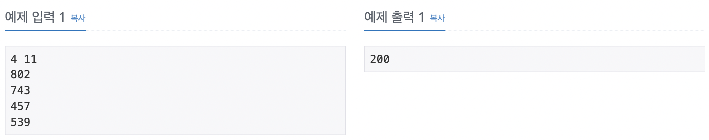 첫째 줄에는 오영식이 이미 가지고 있는 랜선의 개수 K, 그리고 필요한 랜선의 개수 N이 입력된다. K는 1이상 10,000이하의 정수이고, N은 1이상 1,000,000이하의 정수이다. 그리고 항상 K ≦ N 이다. 그 후 K줄에 걸쳐 이미 가지고 있는 각 랜선의 길이가 센티미터 단위의 정수로 입력된다. 랜선의 길이는 231-1보다 작거나 같은 자연수이다.