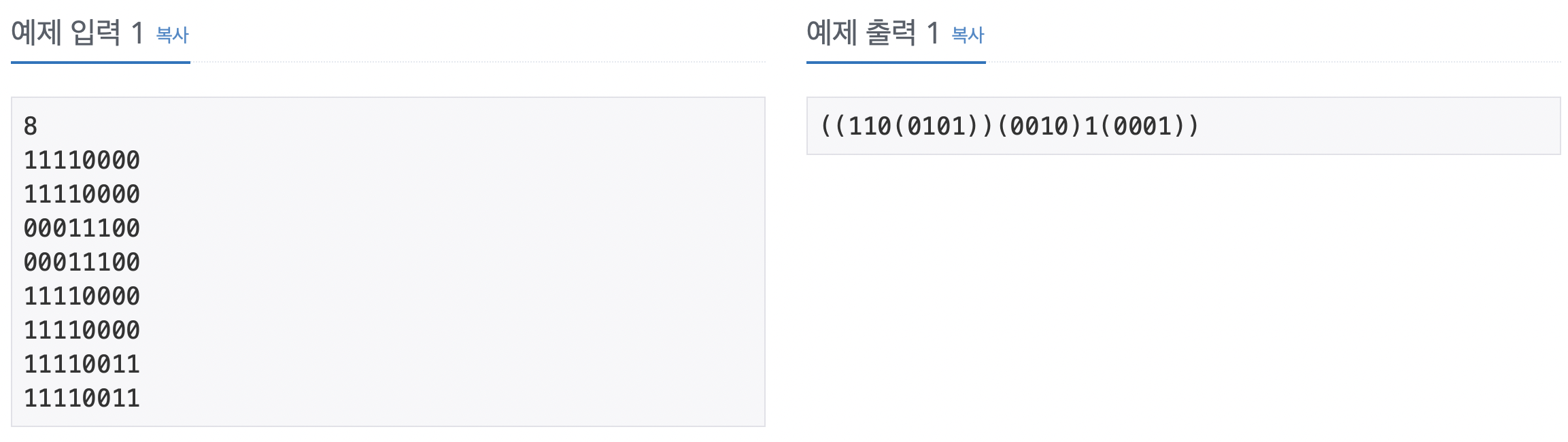 위 그림에서 왼쪽의 영상은 오른쪽의 배열과 같이 숫자로 주어지며, 이 영상을 쿼드 트리 구조를 이용하여 압축하면 "(0(0011)(0(0111)01)1)"로 표현된다. N ×N 크기의 영상이 주어질 때, 이 영상을 압축한 결과를 출력하는 프로그램을 작성하시오.