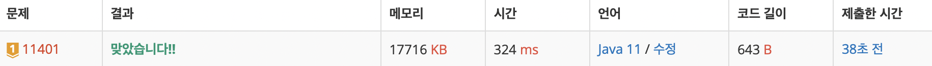이를 마치면 (n k) 줄에 해당하는 식이 완성되어있고 이 배열의 k번째 index의 값을 출력하면 된다.
