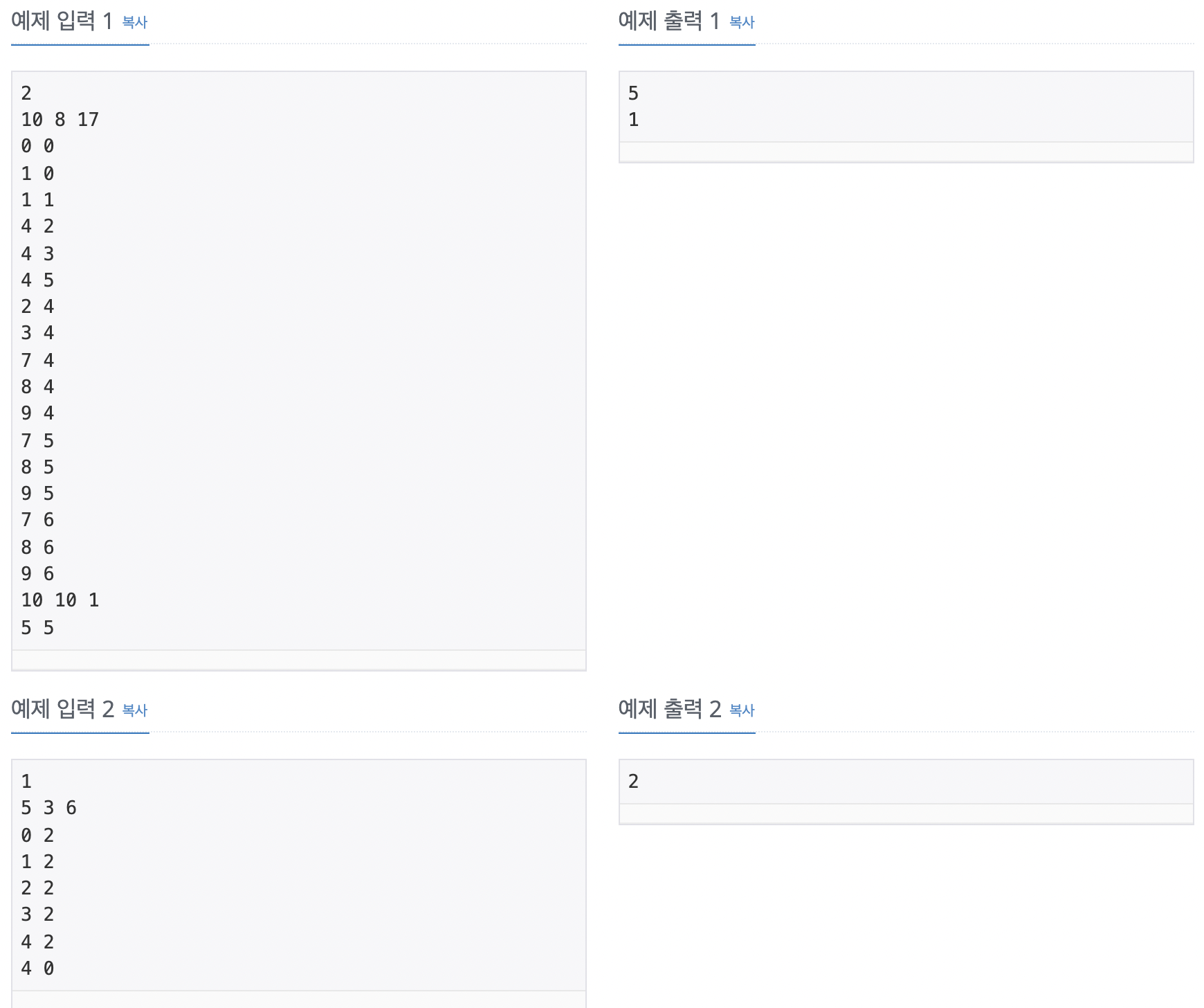 입력의 첫 줄에는 테스트 케이스의 개수 T가 주어진다. 그 다음 줄부터 각각의 테스트 케이스에 대해 첫째 줄에는 배추를 심은 배추밭의 가로길이 M(1 ≤ M ≤ 50)과 세로길이 N(1 ≤ N ≤ 50), 그리고 배추가 심어져 있는 위치의 개수 K(1 ≤ K ≤ 2500)이 주어진다. 그 다음 K줄에는 배추의 위치 X(0 ≤ X ≤ M-1), Y(0 ≤ Y ≤ N-1)가 주어진다. 두 배추의 위치가 같은 경우는 없다.