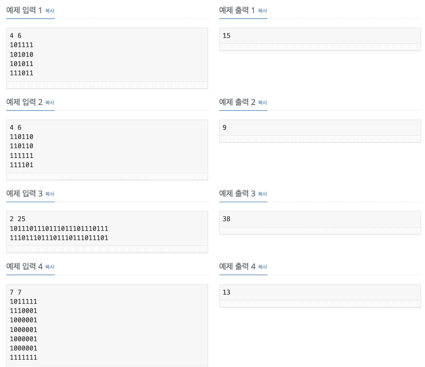 첫째 줄에 두 정수 N, M(2 ≤ N, M ≤ 100)이 주어진다. 다음 N개의 줄에는 M개의 정수로 미로가 주어진다. 각각의 수들은 붙어서 입력으로 주어진다.