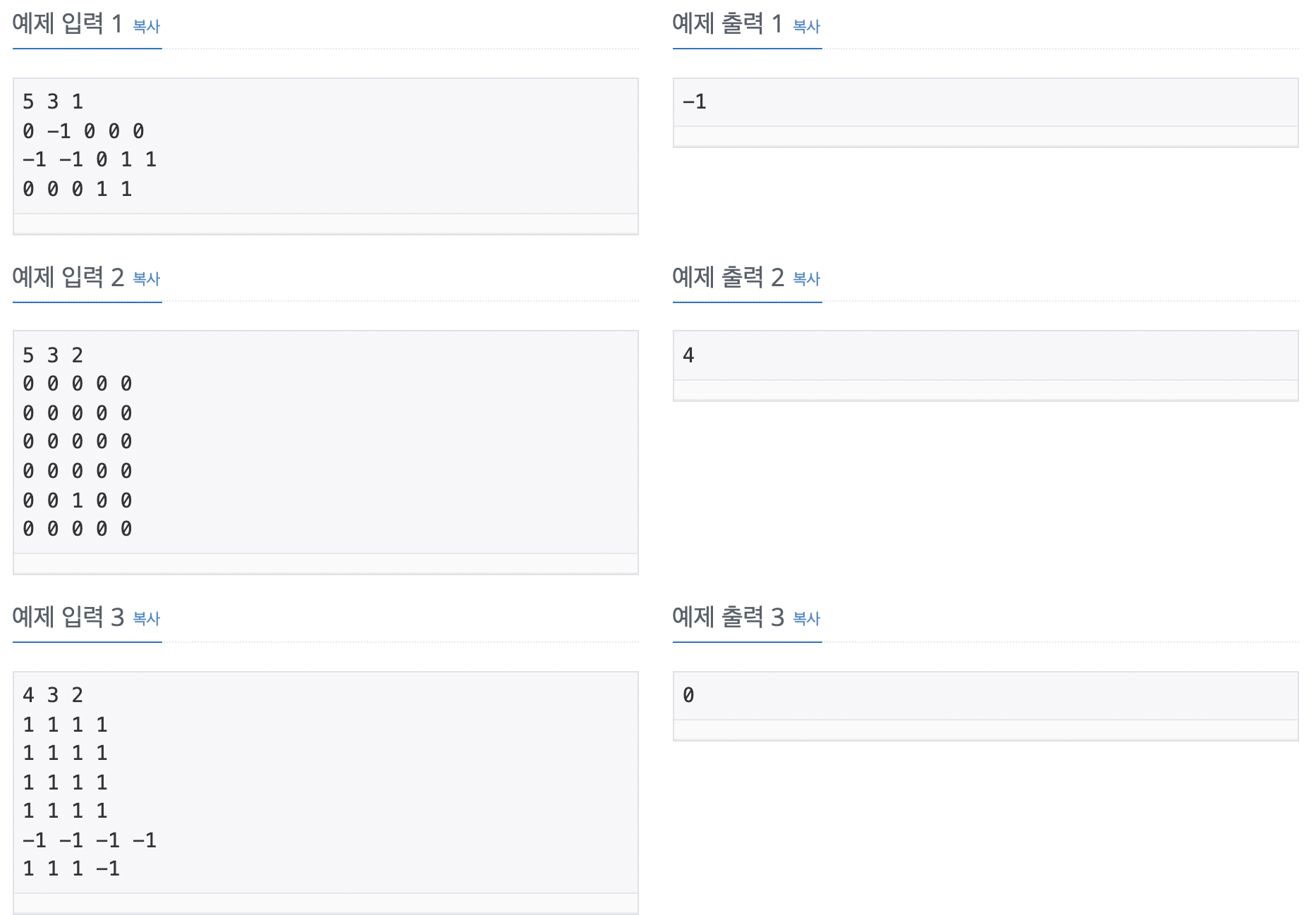 여러분은 토마토가 모두 익을 때까지 최소 며칠이 걸리는지를 계산해서 출력해야 한다. 만약, 저장될 때부터 모든 토마토가 익어있는 상태이면 0을 출력해야 하고, 토마토가 모두 익지는 못하는 상황이면 -1을 출력해야 한다.