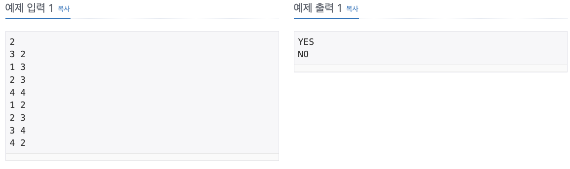 K개의 줄에 걸쳐 입력으로 주어진 그래프가 이분 그래프이면 YES, 아니면 NO를 순서대로 출력한다.