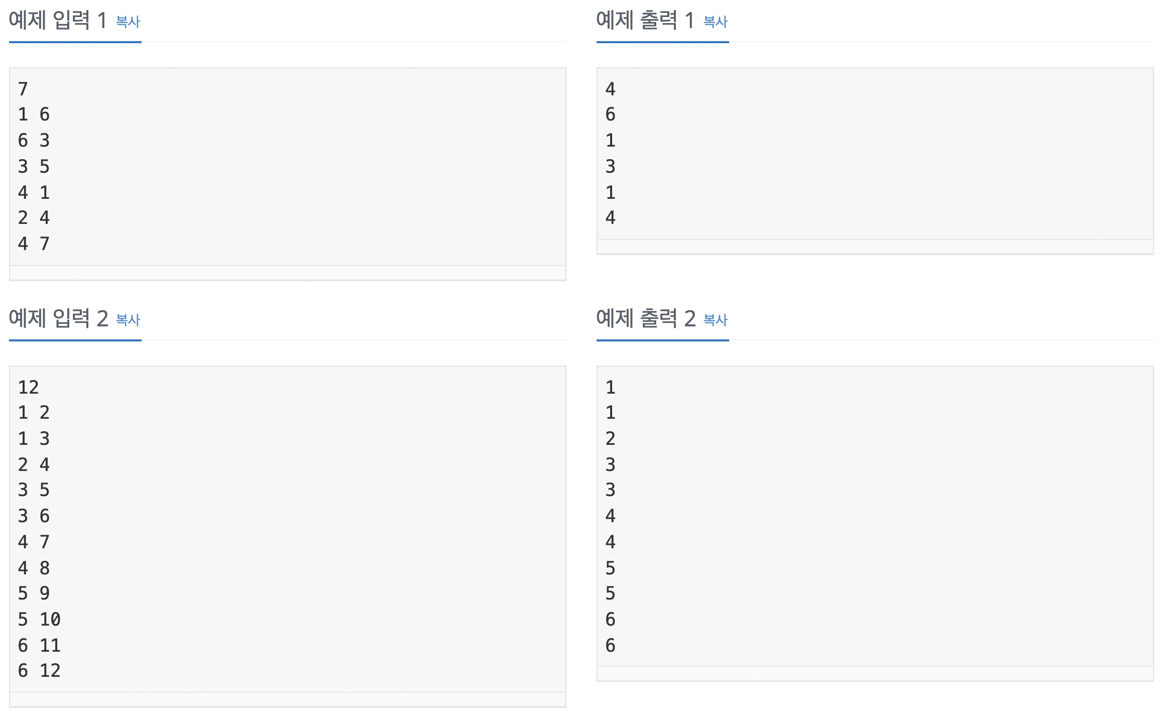 루트 없는 트리가 주어진다. 이때, 트리의 루트를 1이라고 정했을 때, 각 노드의 부모를 구하는 프로그램을 작성하시오.