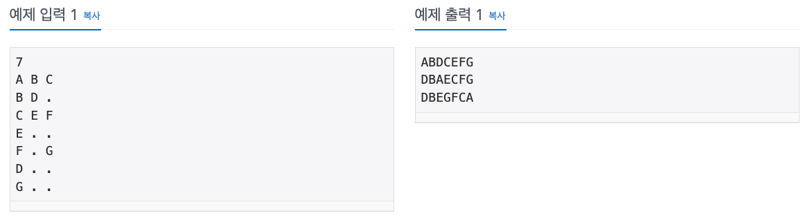 첫째 줄에는 이진 트리의 노드의 개수 N(1 ≤ N ≤ 26)이 주어진다. 둘째 줄부터 N개의 줄에 걸쳐 각 노드와 그의 왼쪽 자식 노드, 오른쪽 자식 노드가 주어진다. 노드의 이름은 A부터 차례대로 알파벳 대문자로 매겨지며, 항상 A가 루트 노드가 된다. 자식 노드가 없는 경우에는 .으로 표현한다.