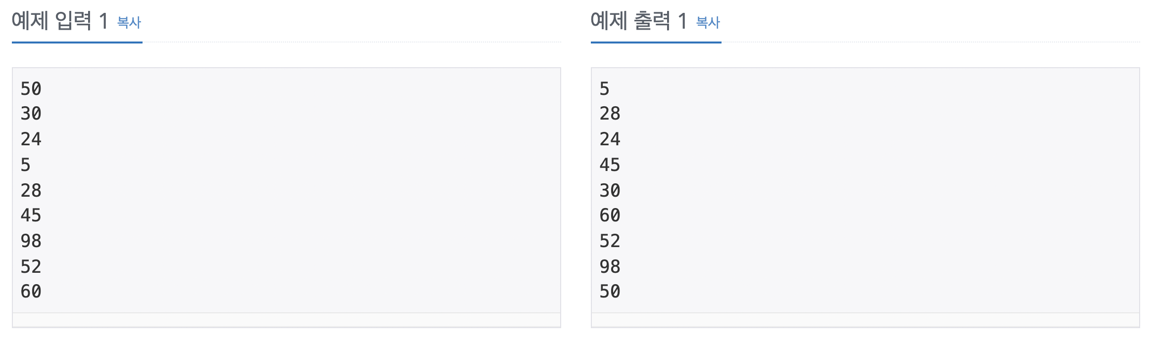 이진 검색 트리를 전위 순회한 결과가 주어졌을 때, 이 트리를 후위 순회한 결과를 구하는 프로그램을 작성하시오.