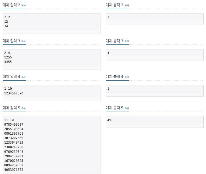 첫째 줄에 N과 M이 주어진다. N과 M은 50보다 작거나 같은 자연수이다. 둘째 줄부터 N개의 줄에 수가 주어진다.