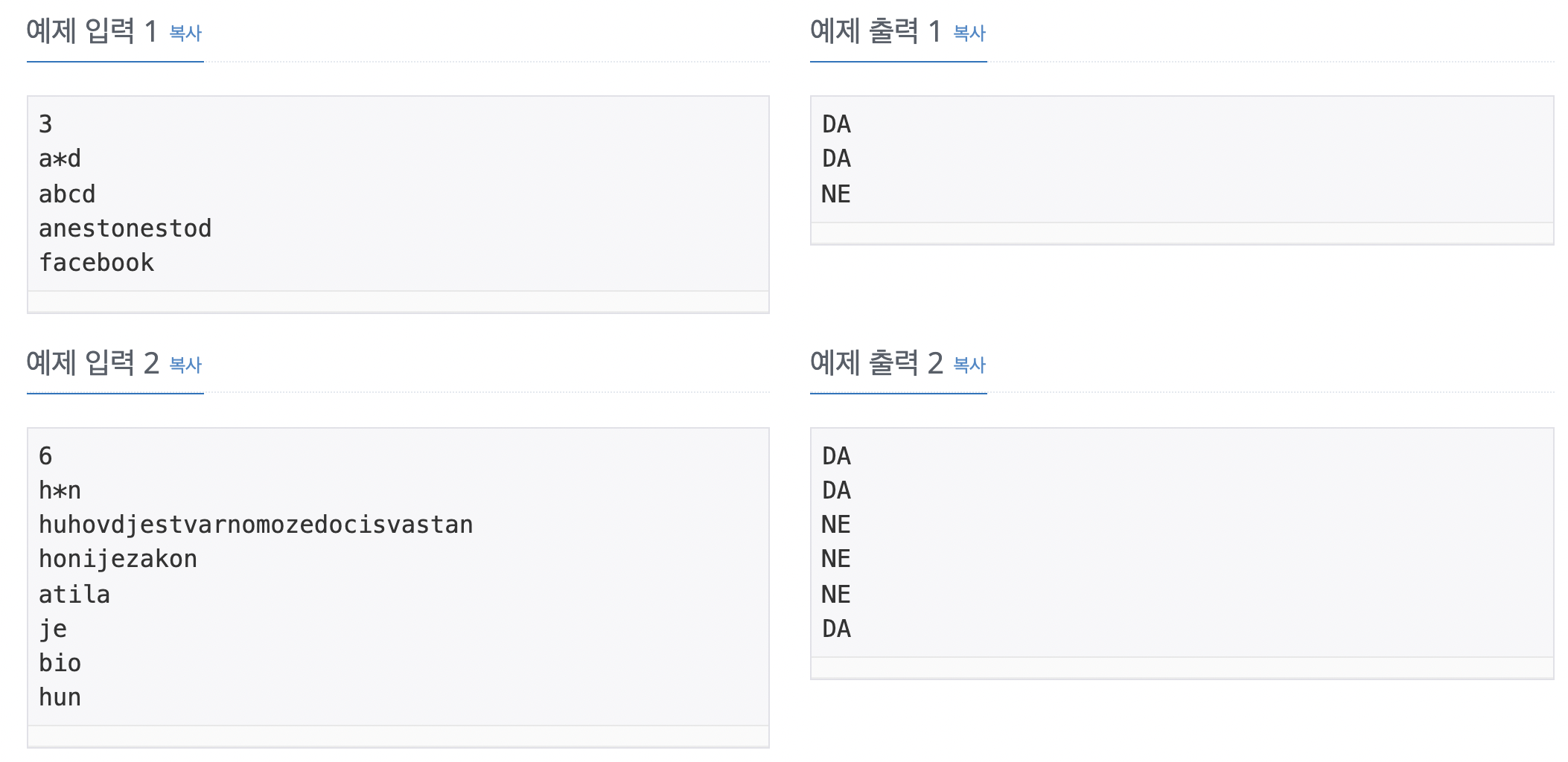 총 N개의 줄에 걸쳐서, 입력으로 주어진 i번째 파일 이름이 패턴과 일치하면 "DA", 일치하지 않으면 "NE"를 출력한다.