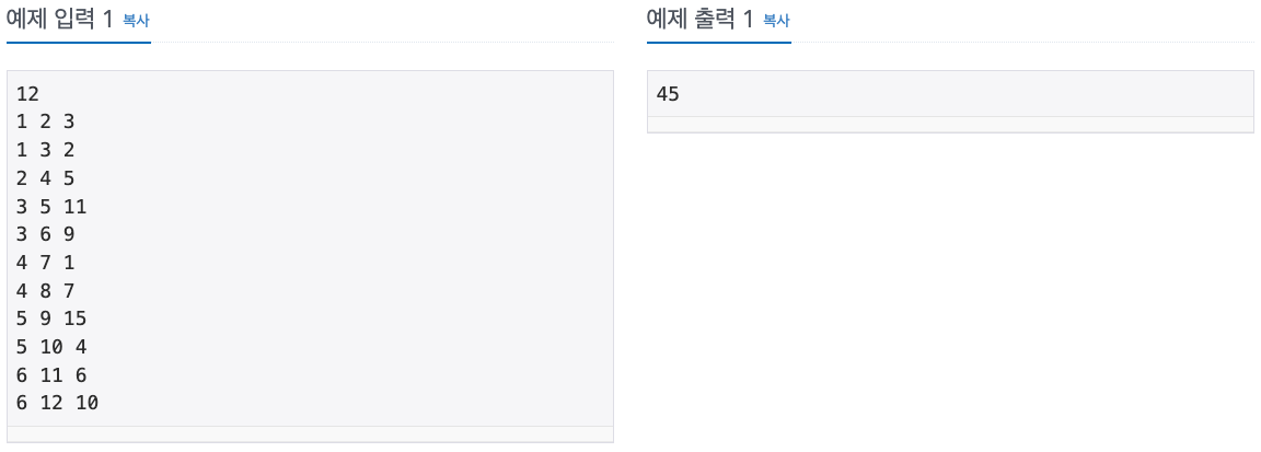 파일의 첫 번째 줄은 노드의 개수 n(1 ≤ n ≤ 10,000)이다. 둘째 줄부터 n-1개의 줄에 각 간선에 대한 정보가 들어온다. 간선에 대한 정보는 세 개의 정수로 이루어져 있다. 첫 번째 정수는 간선이 연결하는 두 노드 중 부모 노드의 번호를 나타내고, 두 번째 정수는 자식 노드를, 세 번째 정수는 간선의 가중치를 나타낸다. 간선에 대한 정보는 부모 노드의 번호가 작은 것이 먼저 입력되고, 부모 노드의 번호가 같으면 자식 노드의 번호가 작은 것이 먼저 입력된다. 루트 노드의 번호는 항상 1이라고 가정하며, 간선의 가중치는 100보다 크지 않은 양의 정수이다.