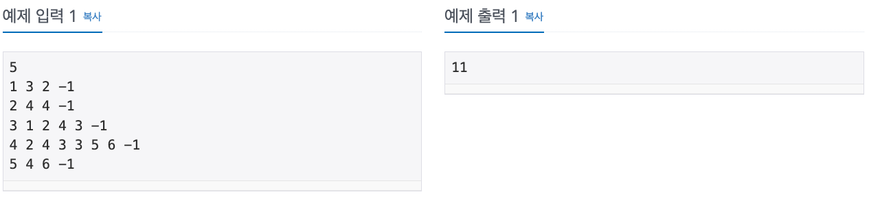 먼저 정점 번호가 주어지고, 이어서 연결된 간선의 정보를 의미하는 정수가 두 개씩 주어지는데, 하나는 정점번호, 다른 하나는 그 정점까지의 거리이다. 예를 들어 네 번째 줄의 경우 정점 3은 정점 1과 거리가 2인 간선으로 연결되어 있고, 정점 4와는 거리가 3인 간선으로 연결되어 있는 것을 보여준다. 각 줄의 마지막에는 -1이 입력으로 주어진다. 주어지는 거리는 모두 10,000 이하의 자연수이다.