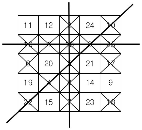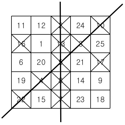 먼저 아래와 같이 25개의 칸으로 이루어진 빙고판에 1부터 25까지 자연수를 한 칸에 하나씩 쓴다