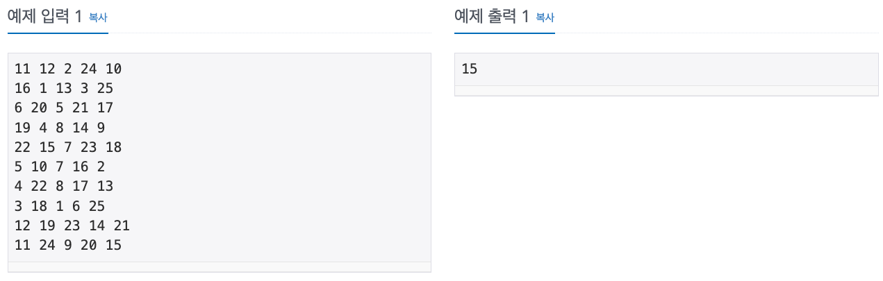 첫째 줄부터 다섯째 줄까지 빙고판에 쓰여진 수가 가장 위 가로줄부터 차례대로 한 줄에 다섯 개씩 빈 칸을 사이에 두고 주어진다. 여섯째 줄부터 열째 줄까지 사회자가 부르는 수가 차례대로 한 줄에 다섯 개씩 빈 칸을 사이에 두고 주어진다. 빙고판에 쓰여진 수와 사회자가 부르는 수는 각각 1부터 25까지의 수가 한 번씩 사용된다.