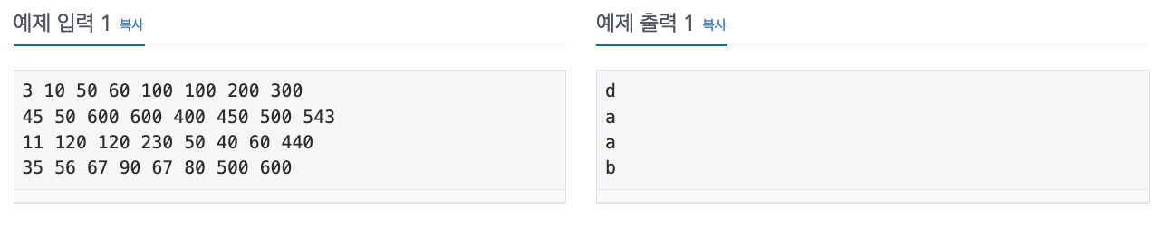 4개의 각 줄에 주어진 두 직사각형의 공통부분을 조사해서 해당하는 코드 문자를 출력파일의 첫 4개의 줄에 각각 차례대로 출력해야 한다.
