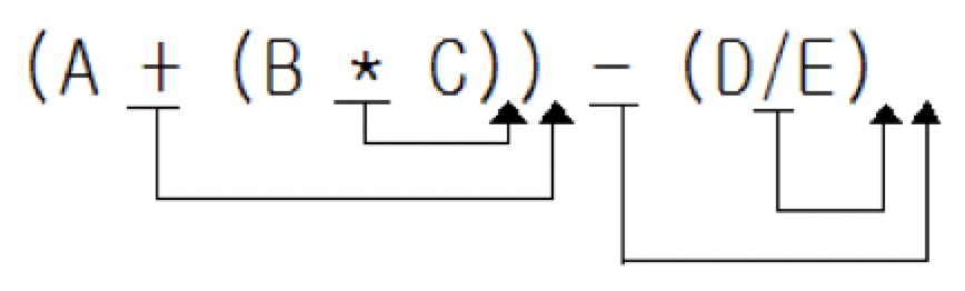 다른 예를 들어 그림으로 표현하면 A+B*C-D/E를 완전하게 괄호로 묶고 연산자를 이동시킬 장소를 표시하면 다음과 같이 된다.