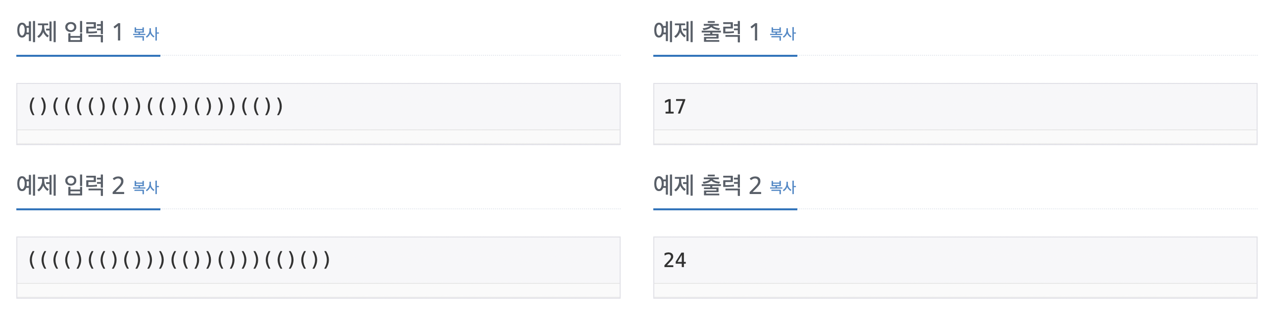 쇠막대기와 레이저의 배치를 나타내는 괄호 표현이 주어졌을 때, 잘려진 쇠막대기 조각의 총 개수를 구하는 프로그램을 작성하시오.