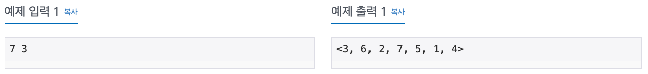 1번부터 N번까지 N명의 사람이 원을 이루면서 앉아있고, 양의 정수 K(≤ N)가 주어진다. 이제 순서대로 K번째 사람을 제거한다. 한 사람이 제거되면 남은 사람들로 이루어진 원을 따라 이 과정을 계속해 나간다. 이 과정은 N명의 사람이 모두 제거될 때까지 계속된다. 원에서 사람들이 제거되는 순서를 (N, K)-요세푸스 순열이라고 한다. 예를 들어 (7, 3)-요세푸스 순열은 <3, 6, 2, 7, 5, 1, 4>이다.